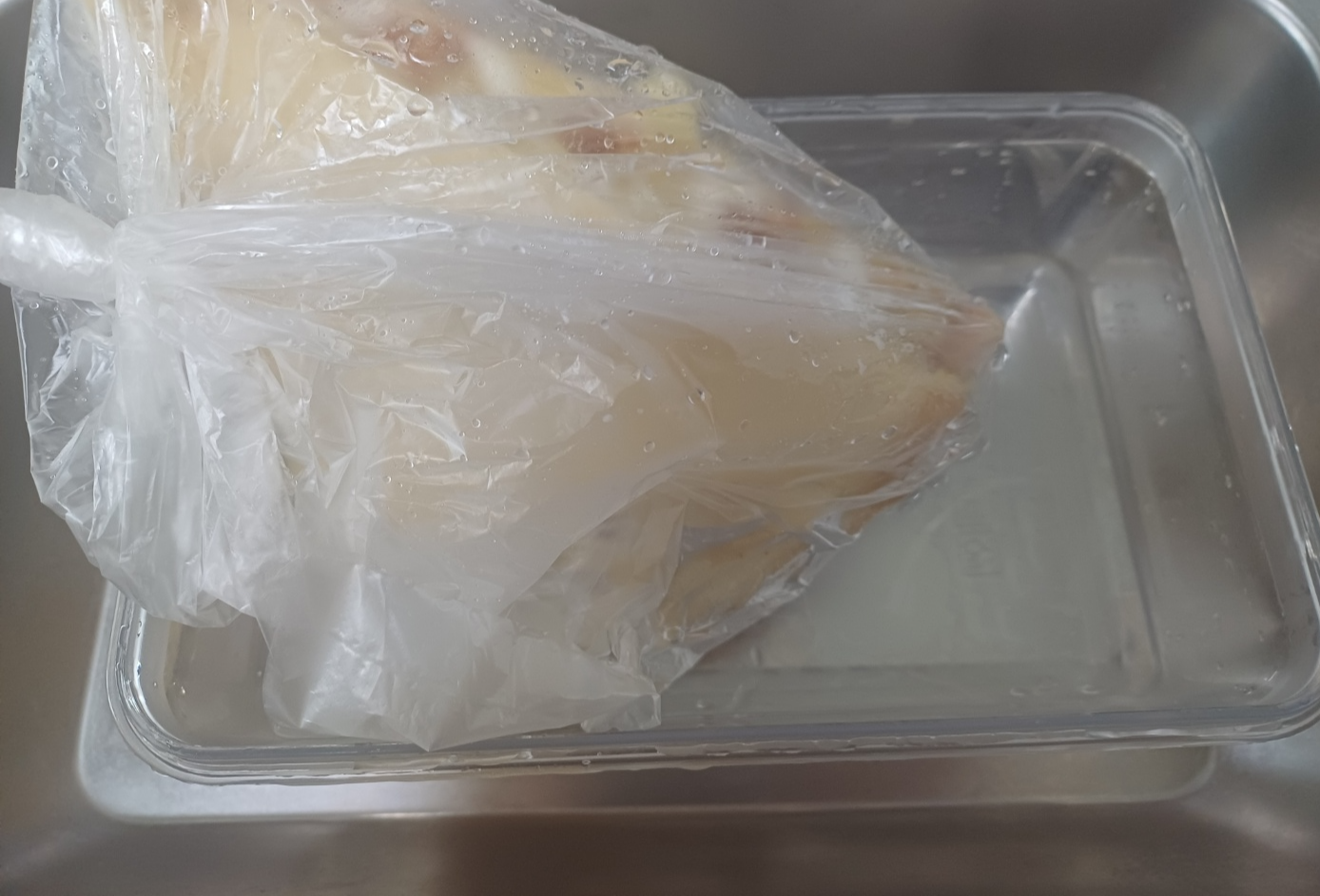 물에 담가놓기만 했는데 해동이 금방에 됩니다.